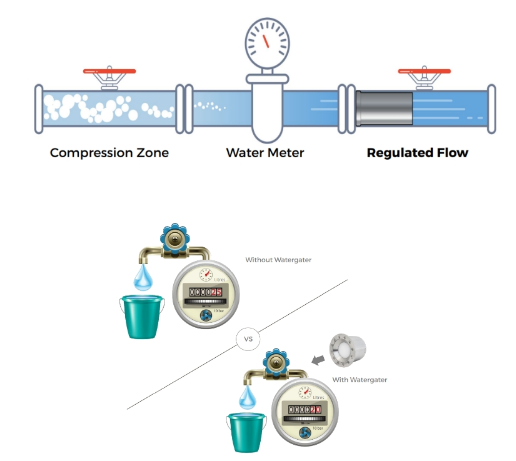 The Watergater Valve reduces the air volume in your water flow, thereby ensuring accurate water meter readings. This is possible as our proprietary technology creates an area of laminar flow upstream through and downstream of the water meter by creating a specific degree of compression.